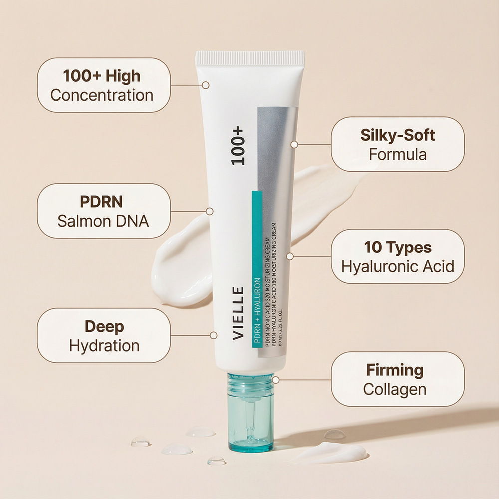 Vielle combines the breakthrough science of PDRN with the deep hydration of 100% Hyaluronic Acid—creating a formula that works on two levels simultaneously.